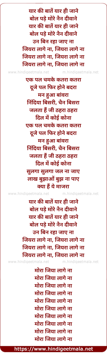 Lyrics of Jiya Lage Na - यार की बातें यार ही जाने