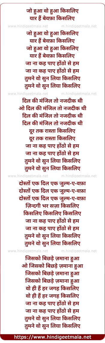 Lyrics of Jo Hua Woh Hua Kis Liye - जो हुआ वो हुआ किसलिए
