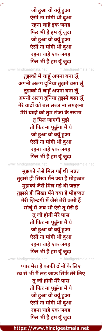 Lyrics of Jo Hua Woh Kyun Hua - जो हुआ वो क्यूँ हुआ