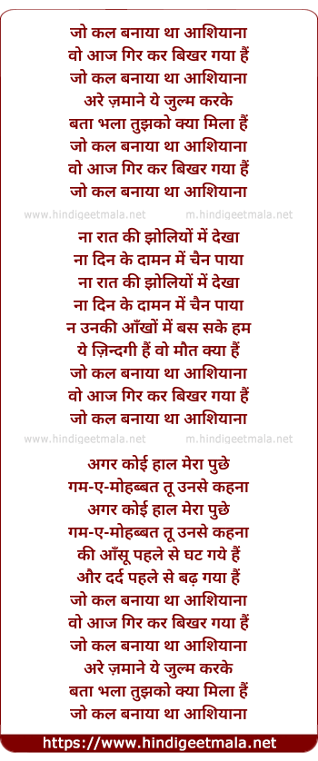 Lyrics of Jo Kal Banaya Tha Aashiyana - जो कल बनाया था आशियाना