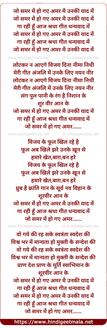 Lyrics of Jo Samar Me Ho Gae Amar - जो समर में हो गए अमर