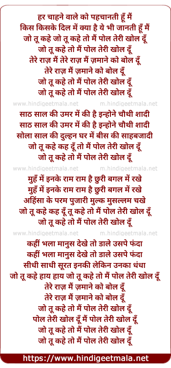 Lyrics of Jo Tu Kahe To Main Pol Teri Khol Du - जो तू कहे तो मैं पोल तेरी खोल दूँ