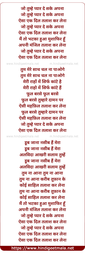 Poetic Translation - Lyrics of Jo Tumhe Pyar De Sake Apna - जो तुम्हे प्यार दे सके अपना
