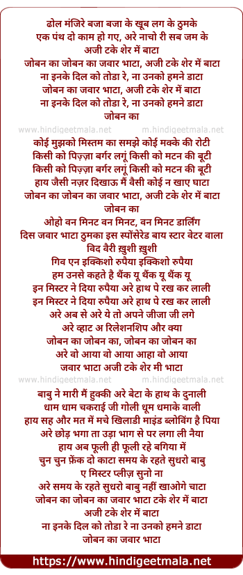 Lyrics of Joban Ka Jawar Bata - जोबन का जवार भाटा