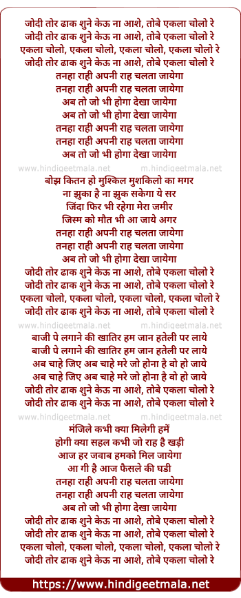Lyrics of Jodi Tor Dak Shune Keu Na Ashe, Tobe Ekla Cholo Re - जोड़ी तोर ढाक शुने केऊ ना आशे, तोबे एकला चोलो रे