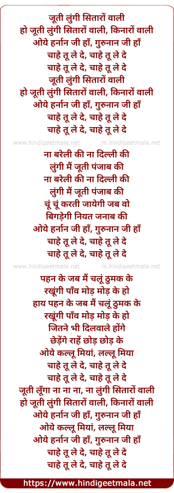 Lyrics of Jooti Lungi Sitaro Wali - जूती लुंगी सितारों वाली
