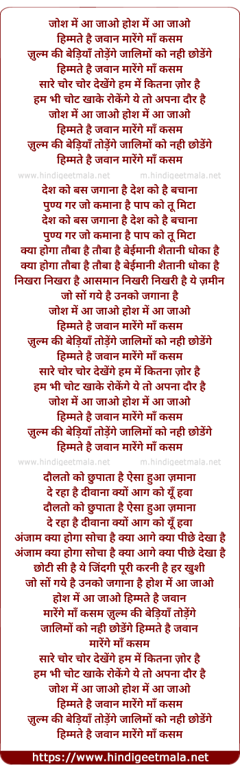 Lyrics of Josh Mein Aa Jaaon - जोश में आ जाओ