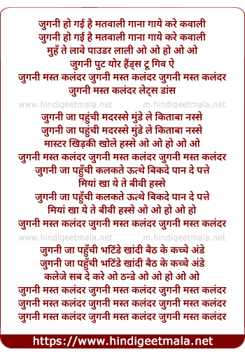 Lyrics of Jugni Mast Kalandar - जुगनी हो गई है मतवाली गाना गाये करे कवाली