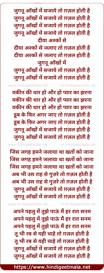 Lyrics of Jugnu Ankhon Mai - जुगनू आँखों में सजाये तो ग़ज़ल होती है