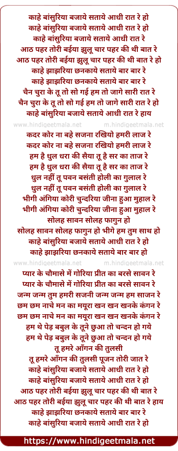 Lyrics of Kaahe Bansuriya Bajaye - काहे बांसुरिया बजाये सताये आधी रात रे हो