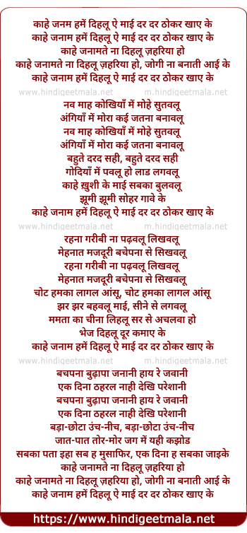 kaahe janam hame dihlu ae maayi dar dar thokar khaye ke