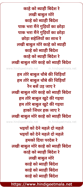 Lyrics of Kahe Ko Byahi Bides Re - काहे को ब्याही बिदेश रे