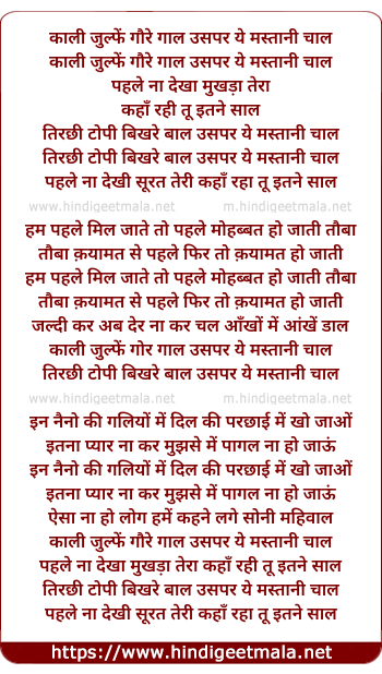 Lyrics of Kaali Zulfe Gore Gaal Uspar Ye Mastani Chal - काली जुल्फें गौरे गाल उसपर ये मस्तानी चाल