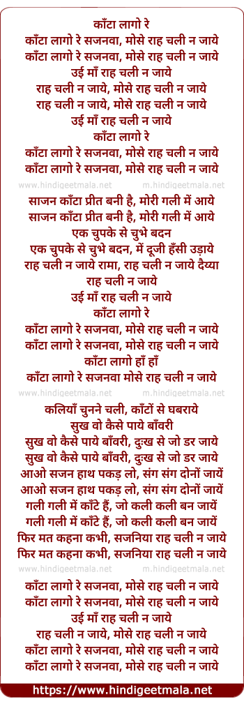 Lyrics of Kaantaa Laago Re Sajanavaa Mose Raah Chali Na Jaaye - काँटा लागो रे