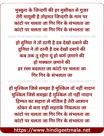 Lyrics of Kaanto Par Chalta Jaa - मुस्कुरा के जिन्दगी की हर मुसीबत से गुजर