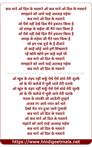 Lyrics of Kab Mane O Dil Ke Mastane - कब माने ओ दिल के मस्ताने