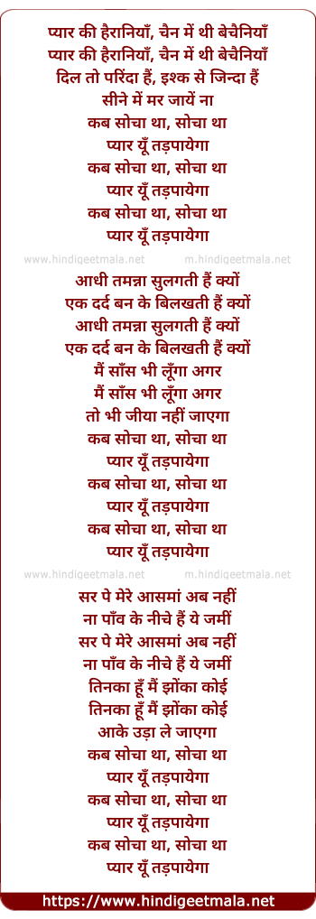 Lyrics of Kab Socha Tha, Pyaar Yun Tadpaayega - कब सोचा था, प्यार यूँ तड़पायेगा