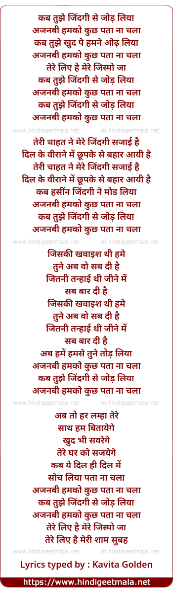 Lyrics of Kab Tujhe Jindagee Se Jod Liya - कब तुझे जिंदगी से जोड़ लिया