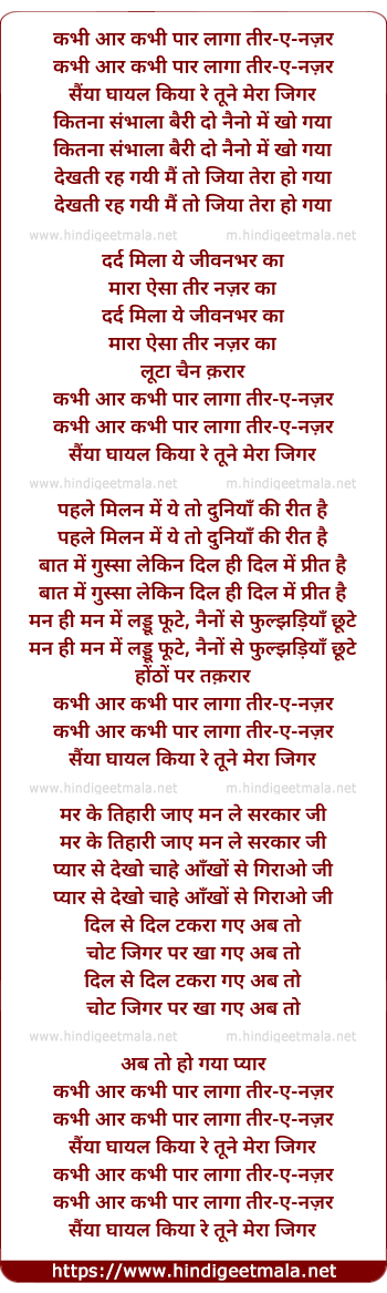 Lyrics of Kabhi Aar Kabhi Paar Laga Tire Najar - कभी आर कभी पार लागा तीर-ए-नज़र