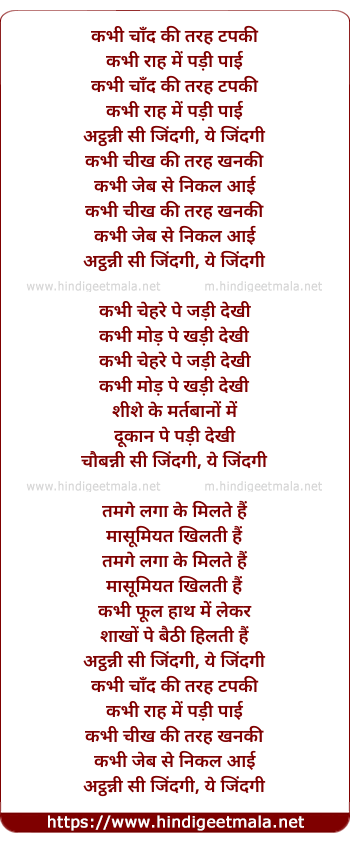 Lyrics of Kabhi Chand Ki Tarah Tapaki, Atthanni Si Zindagi - कभी चाँद की तरह टपकी, अट्ठन्नी सी जिंदगी