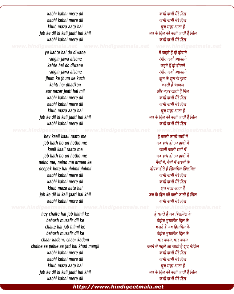 Lyrics of Kabhi Kabhi Mere Dil Khub Maza Aata Hai - कभी कभी मेरे दिल खूब मजा आता है