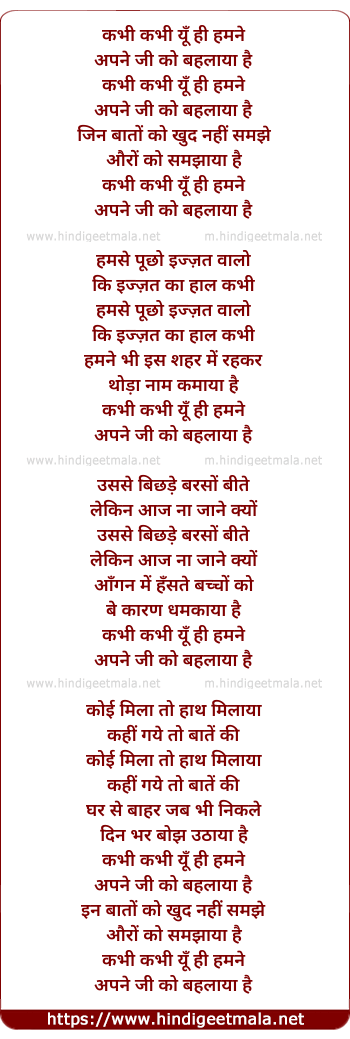 Lyrics of Kabhi Kabhi Yunhi Hamane Apane Ji Ko Bahalaayaa Hai - कभी कभी यूँ ही हमने