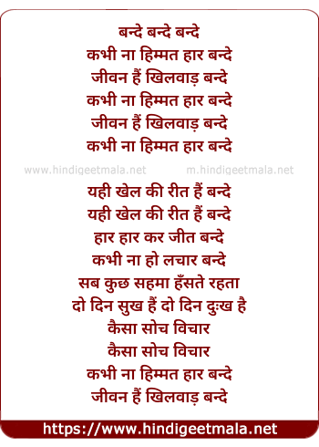 Lyrics of Kabhi Na Himmat Na Haar Bandi - बन्दे बन्दे बन्दे