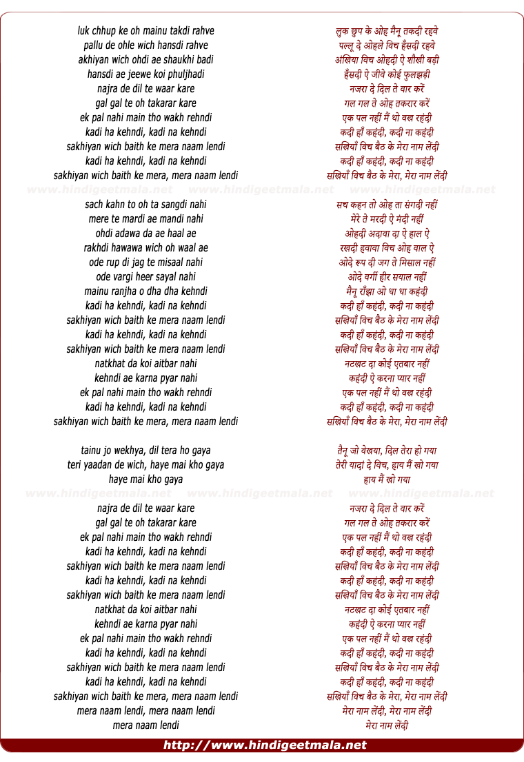 Lyrics of Kadee Han Kehndee Kadee Na Kehndee - लुक छुप के ओह मैनू तकदी रहवे