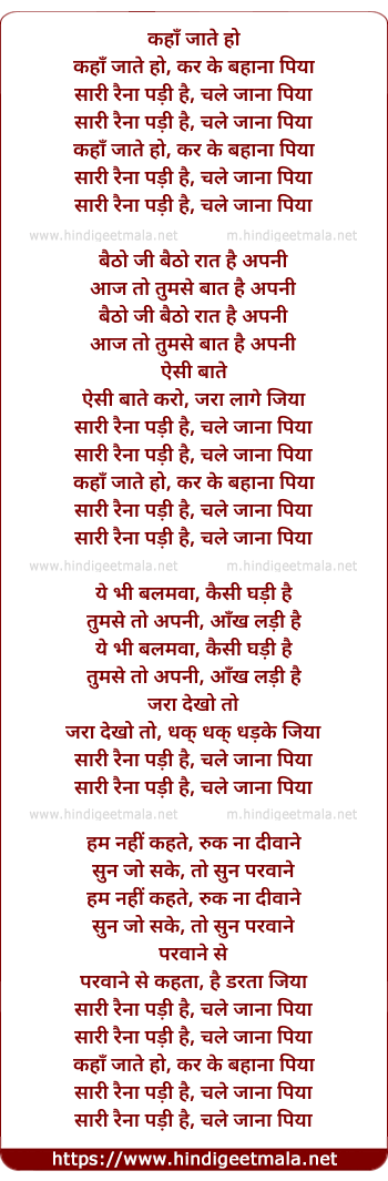 Lyrics of Kahan Jate Ho Kar Ke Bahana Piya, Sari Raina Padi Chale Jana Piya - कहाँ जाते हो कर के बहाना पिया, सारी रैना पड़ी है चले जाना पिया