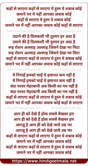 Lyrics of Kahan Se Layega, Ye Husn Ye Shbab Koi - कहाँ से लाएगा ये हुस्न ये शबाब कोई