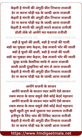Lyrics of Kahati Hai Mangani Ki Anguthi - कहती है मंगनी की अंगूठी