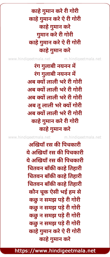 Lyrics of Kahe Guman Kare Ri Gori - काहे गुमान करे री गोरी