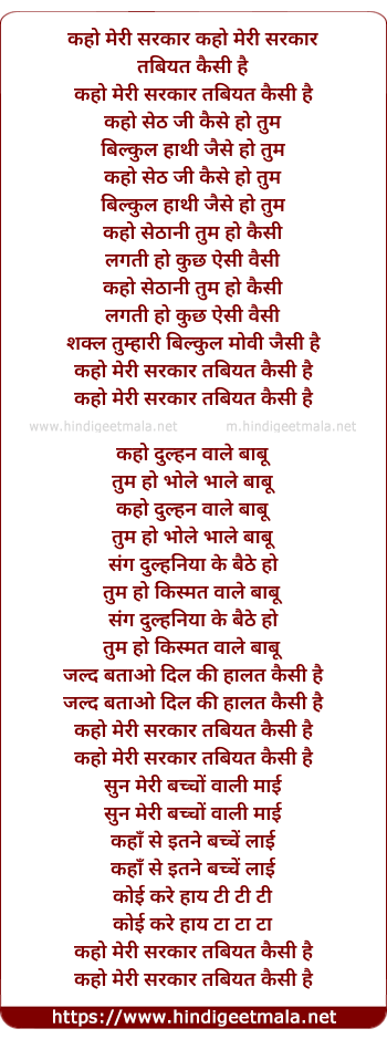 Lyrics of Kaho Meri Sarkar Tabeeyat Kaisi Hai - कहो मेरी सरकार तबियत कैसी है