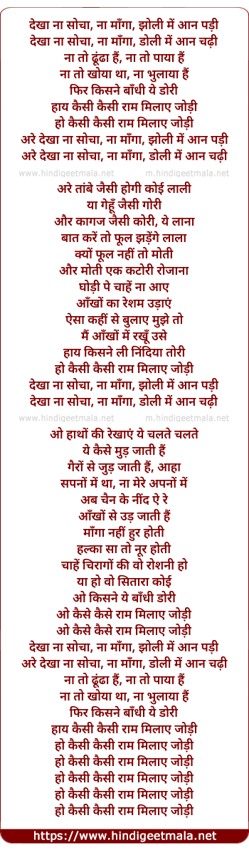 Lyrics of Kaise Kaisee Ram Milaye Jodi ( Remix ) - देखा ना सोचा, ना माँगा, झोली में आन पड़ी
