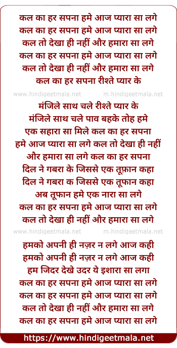 Lyrics of Kal Ka Har Sapna Hame, Aaj Pyara Sa Lage