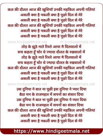 Lyrics of Kal Ki Daulat Aaj Ki Khushiya, Asali Kyaa Hai - कल की दौलत आज की खुशियाँ, असली क्या है