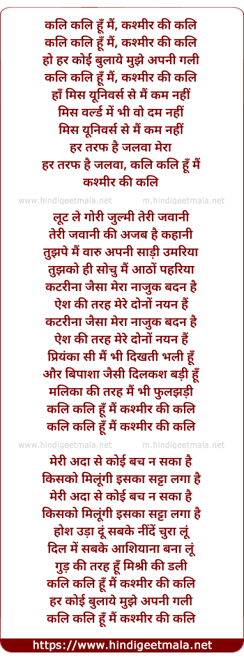 Lyrics of Kali Kali Hoon Main, Kashmir Ki Kali - कलि कलि हूँ मैं, कश्मीर की कलि
