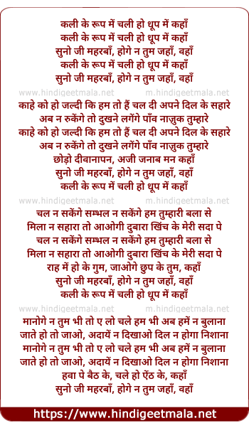 Lyrics of Kali Ke Roop Me, Chali Ho Dhoop Me Kaha - कली के रूप में, चली हो धूप में कहाँ