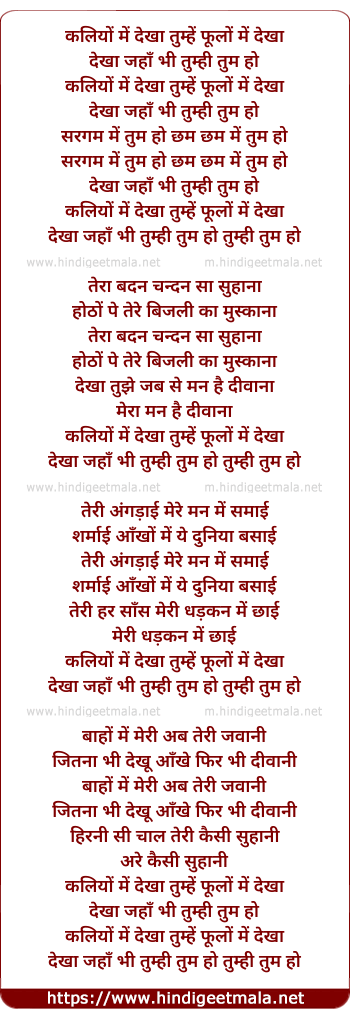 Lyrics of Kaliyo Me Dekha Tumhe, Phulo Me Dekha - कलियों में देखा तुम्हें, फूलों में देखा
