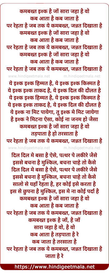 Lyrics of Kamabakt Ishq Hai Jo Saaraa Jahaan Hai Vo - कमबख्त इश्क है जों सारा जहां है वो
