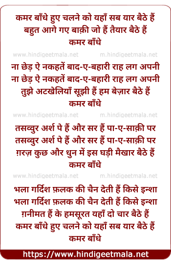 Lyrics of Kamar Baandhe Hue Chalane Ko Yaan Sab Yaar Baithe Hain - कमर बाँधे हुए चलने को यहाँ सब यार बैठे हैं