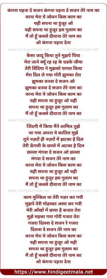 Lyrics of Kangna Pehna De Sajan Tere Naam Ka - कंगना पहना दे सजन तेरे नाम का