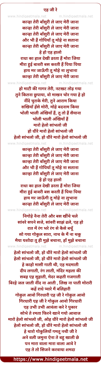 Lyrics of Kanha Teree Basuree Le Jaye Meree Jana - कान्हा तेरी बाँसुरी ले जाए मेरी जाना