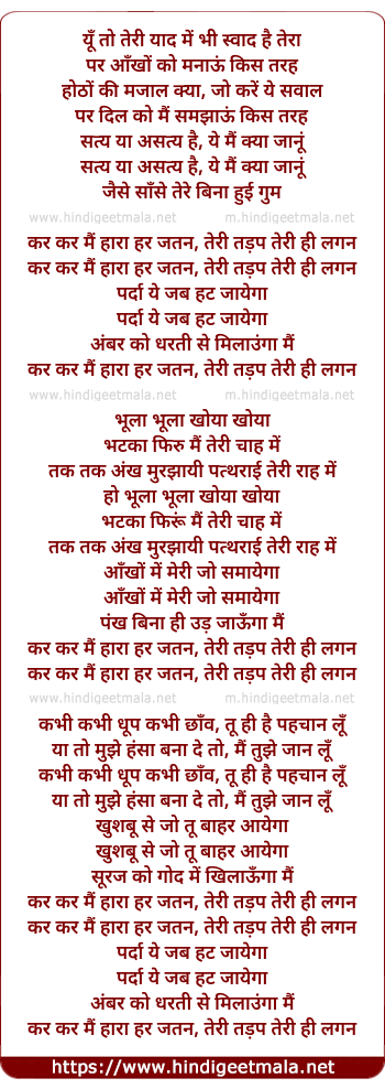 Lyrics of Kar Kar Main Haara - यूँ तो तेरी याद में भी स्वाद है तेरा
