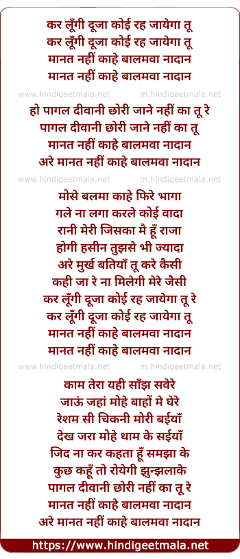 Lyrics of Kar Lungi Duja Koi Rah Jayega Tu - कर लूँगी दूजा कोई रह जायेगा तू