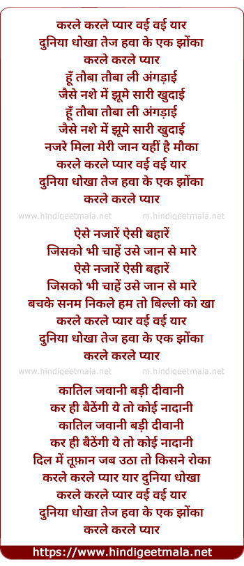 Lyrics of Karle Karle Pyar Vai Vai Yaar - करले करले प्यार वई वई यार