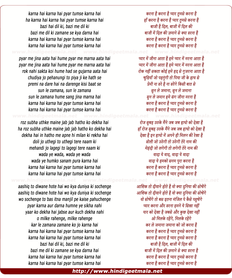 Lyrics of Karna Hai Karna Hai Pyar Tumse Karna Hai - करना है करना है प्यार तुमसे करना है