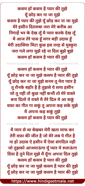 Lyrics of Kasam Hai Pyar Ki Tujhe Yu Chhod Ker Na Ja Mujhe - कसम है प्यार की तुझे यूँ छोड़ कर ना जा मुझे