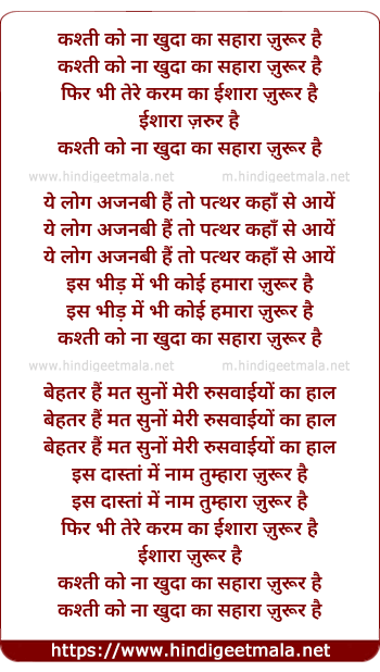 Lyrics of Kashti Ko Na Khuda - कश्ती को ना खुदा का सहारा ज़ुरूर है