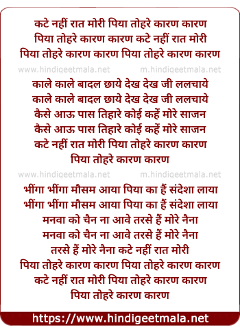 Lyrics of Kate Nahi Raat Mori Piya Tore Karan - कटे नहीं रात मोरी पिया तोहरे कारण कारण